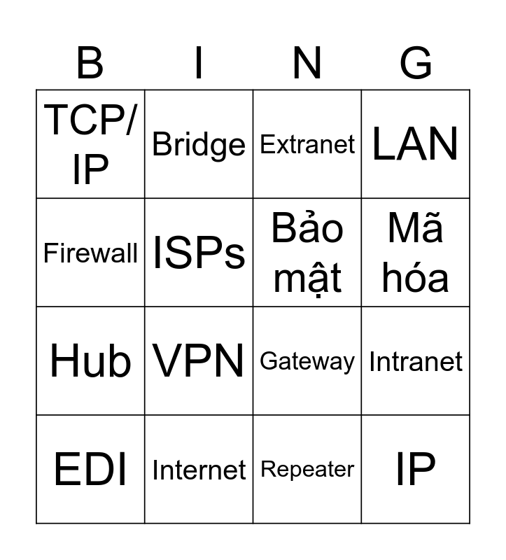 This bingo card has 16 words: Internet, Intranet, Extranet, TCP/ IP, Hub, Bridge, Gateway, Repeater, Firewall, ISPs, EDI, LAN, VPN, Mã hóa, Bảo mật and IP.