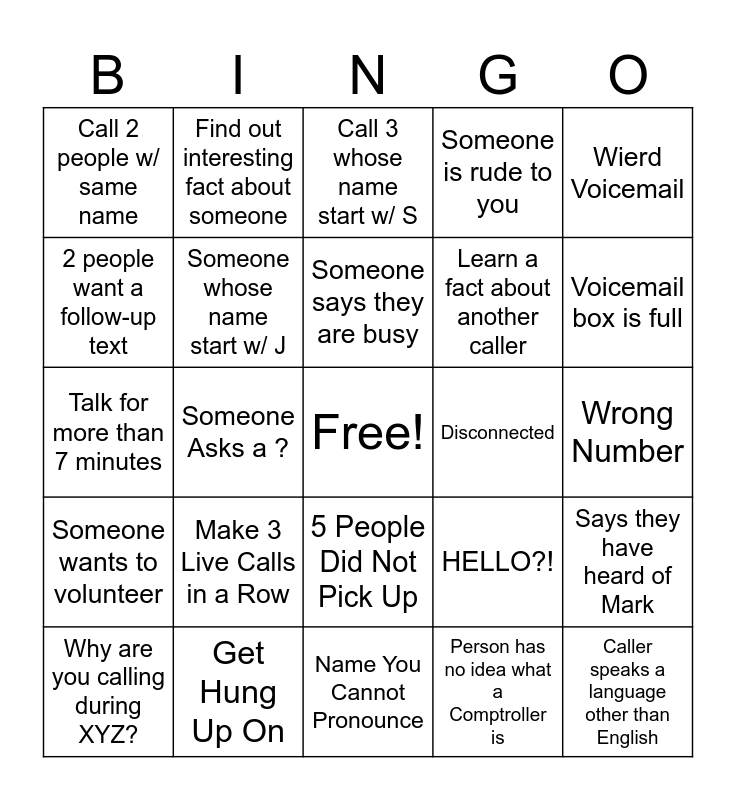 This bingo card has a free space and 24 words: Make 3 Live Calls in a Row, Get Hung Up On, Someone says they are busy, Why are you calling during XYZ?, Wierd Voicemail, Call 2 people w/ same name, 2 people want a follow-up text, Find out interesting fact about someone, Disconnected, 5 People Did Not Pick Up, Learn a fact about another caller, Talk for more than 7 minutes, HELLO?!, Says they have heard of Mark, Someone whose name start w/ J, Person has no idea what a Comptroller is, Wrong Number, Call 3 whose name start w/ S, Voicemail box is full, Someone Asks a ?, Caller speaks a language other than English, Someone wants to volunteer, Someone is rude to you and Name You Cannot Pronounce.