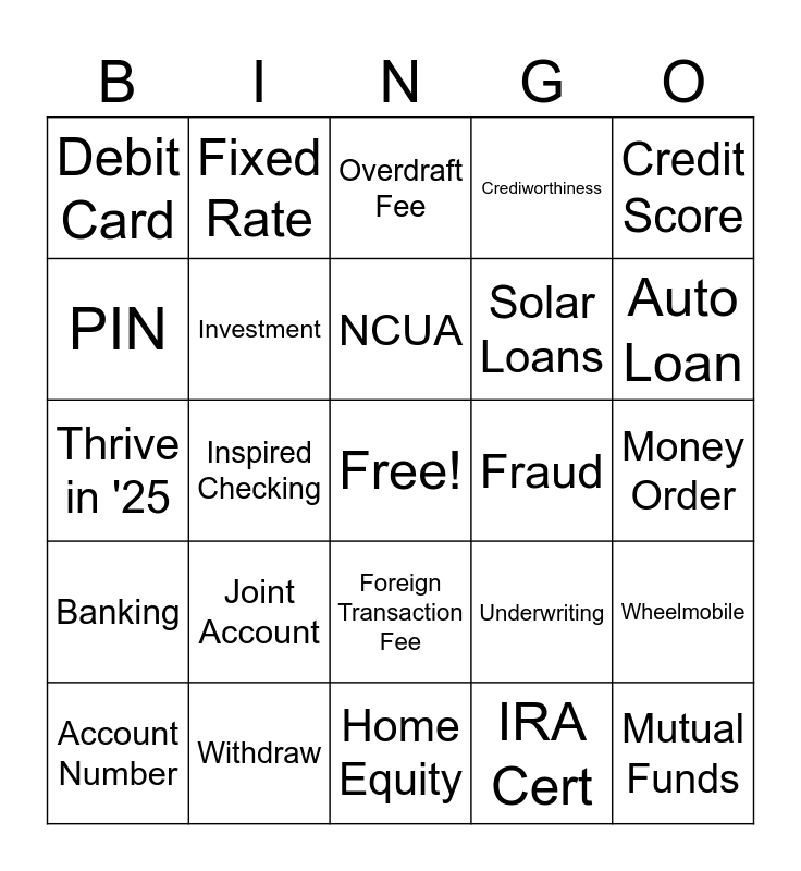 This bingo card has a free space and 34 words: Checking Account, IRA Cert, HELOC, Deposits, Banking, Investment, Credit Score, Account Number, Fixed Rate, Interest Rate, NCUA, Overdraft Fee, Goals, Safe Deposit Box, Fraud, Auto Loan, Withdraw, Thrive in '25, Joint Account, Underwriting, Foreign Transaction Fee, BSA, Debit Card, Money Order, Home Equity, Mutual Funds, Crediworthiness, Mobile Banking, Solar Loans, PIN, ATM, Inspired Checking, Wheelmobile and Routing Number.