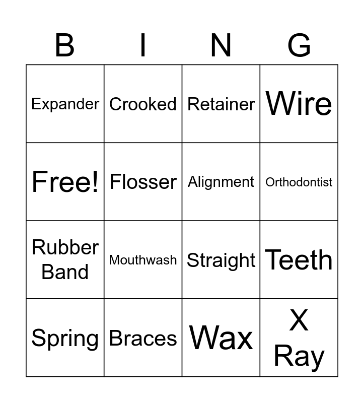 This bingo card has 16 words: Braces, Teeth, Retainer, Expander, Rubber Band, Crooked, Straight, Wax, Free!, Flosser, Spring, Wire, Mouthwash, Orthodontist, Alignment and X Ray.