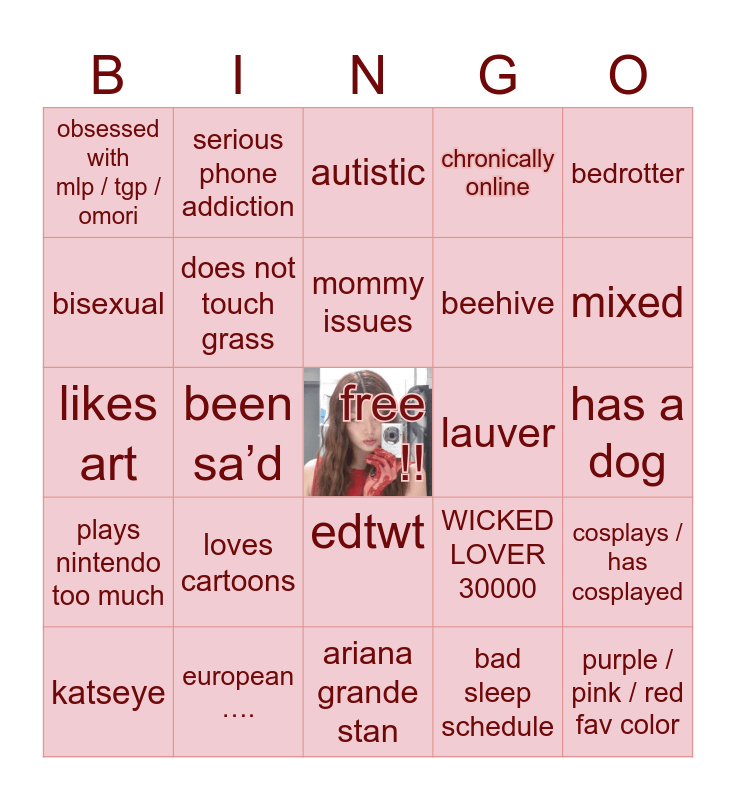 This bingo card has a free space and 24 words: loves cartoons, european …., mommy issues, katseye, bedrotter, obsessed with mlp / tgp / omori, bisexual, serious phone addiction, lauver, edtwt, beehive, likes art, WICKED LOVER 30000, cosplays / has cosplayed, does not touch grass, bad sleep schedule, has a dog, autistic, mixed, been sa’d, purple / pink / red fav color, plays nintendo too much, chronically online and ariana grande stan.