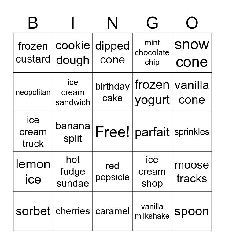 This bingo card has a free space and 29 words: sorbet, gelato, banana split, rainbow sherbet, frozen custard, dipped cone, ice cream sandwich, hot fudge sundae, parfait, cherries, sprinkles, spoon, caramel, vanilla milkshake, vanilla cone, waffle cone, red popsicle, lemon ice, snow cone, ice cream truck, ice cream shop, ice cream scoop, frozen yogurt, neopolitan, mint chocolate chip, cookie dough, moose tracks, birthday cake and cookies 'n cream.