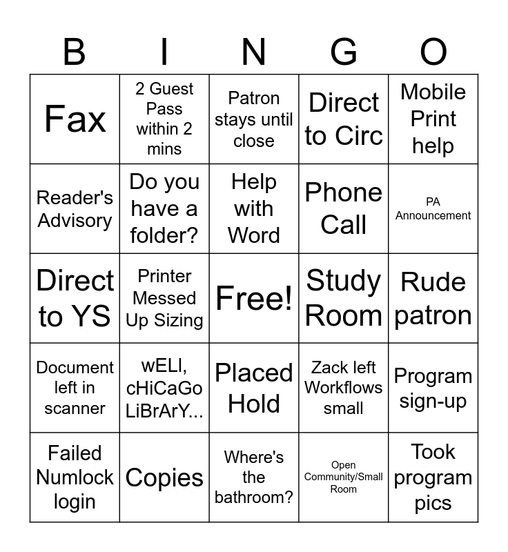 This bingo card has a free space and 24 words: wELl, cHiCaGo LiBrArY..., Copies, Help with Word, Failed Numlock login, Mobile Print help, Fax, Reader's Advisory, 2 Guest Pass within 2 mins, Study Room, Placed Hold, Phone Call, Direct to YS, Zack left Workflows small, Program sign-up, Do you have a folder?, Open Community/Small Room, Rude patron, Patron stays until close, PA Announcement, Printer Messed Up Sizing, Took program pics, Document left in scanner, Direct to Circ and Where's the bathroom?.