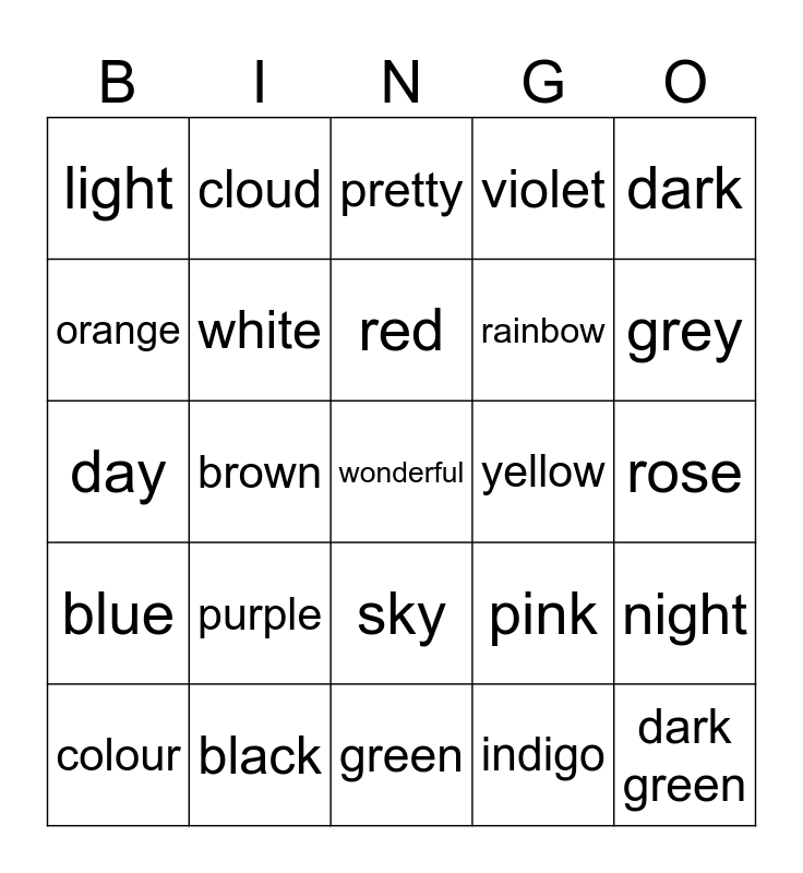 This bingo card has 25 words: purple, green, red, colour, dark, light, orange, cloud, yellow, sky, rainbow, day, pink, night, white, dark green, rose, pretty, grey, brown, wonderful, black, blue, violet and indigo.