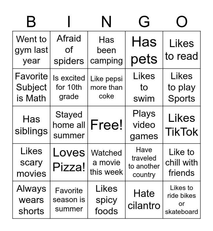 This bingo card has a free space and 24 words: Loves Pizza!, Favorite season is summer, Like pepsi more than coke, Always wears shorts, Likes to read, Went to gym last year, Favorite Subject is Math, Afraid of spiders, Plays video games, Watched a movie this week, Likes to swim, Has siblings, Have traveled to another country, Like to chill with friends, Is excited for 10th grade, Hate cilantro, Likes TikTok, Has been camping, Likes to play Sports, Stayed home all summer, Likes to ride bikes or skateboard, Likes scary movies, Has pets and Likes spicy foods.