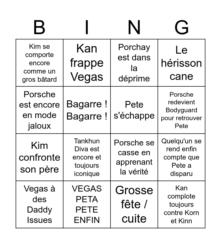 This bingo card has 16 words: VEGAS PETA PETE ENFIN, Quelqu'un se rend enfin compte que Pete a disparu, Porchay est dans la déprime, Kim se comporte encore comme un gros bâtard, Kim confronte son père, Kan frappe Vegas, Porsche se casse en apprenant la vérité, Grosse fête / cuite, Porsche est encore en mode jaloux, Bagarre ! Bagarre !, Vegas à des Daddy Issues, Le hérisson cane, Tankhun Diva est encore et toujours iconique, Porsche redevient Bodyguard pour retrouver Pete, Pete s'échappe and Kan complote toujours contre Korn et Kinn.
