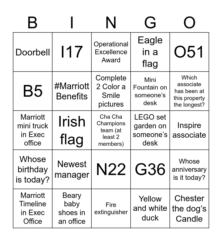 This bingo card has a free space and 24 words: Marriott Timeline in Exec Office, Newest manager, Complete 2 Color a Smile pictures, Yellow and white duck, O51, Doorbell, I17, Operational Excellence Award, LEGO set garden on someone’s desk, Inspire associate, Marriott mini truck in Exec office, #Marriott Benefits, G36, Whose anniversary is it today?, B5, Beary baby shoes in an office, Fire extinguisher, Eagle in a flag, Which associate has been at this property the longest?, Whose birthday is today?, Irish flag, N22, Mini Fountain on someone’s desk and Chester the dog’s Candle.