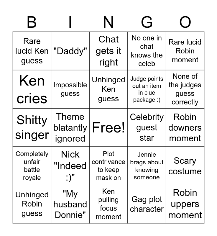 This bingo card has a free space and 24 words: Nick "Indeed :)", "My husband Donnie", Unhinged Ken guess, Unhinged Robin guess, Rare lucid Robin moment, Rare lucid Ken guess, Ken cries, "Daddy", Celebrity guest star, Plot contrivance to keep mask on, Judge points out an item in clue package :), Shitty singer, Jennie brags about knowing someone, Scary costume, Impossible guess, Gag plot character, Robin downers moment, Chat gets it right, None of the judges guess correctly, Theme blatantly ignored, Robin uppers moment, Completely unfair battle royale, No one in chat knows the celeb and Ken pulling focus moment.