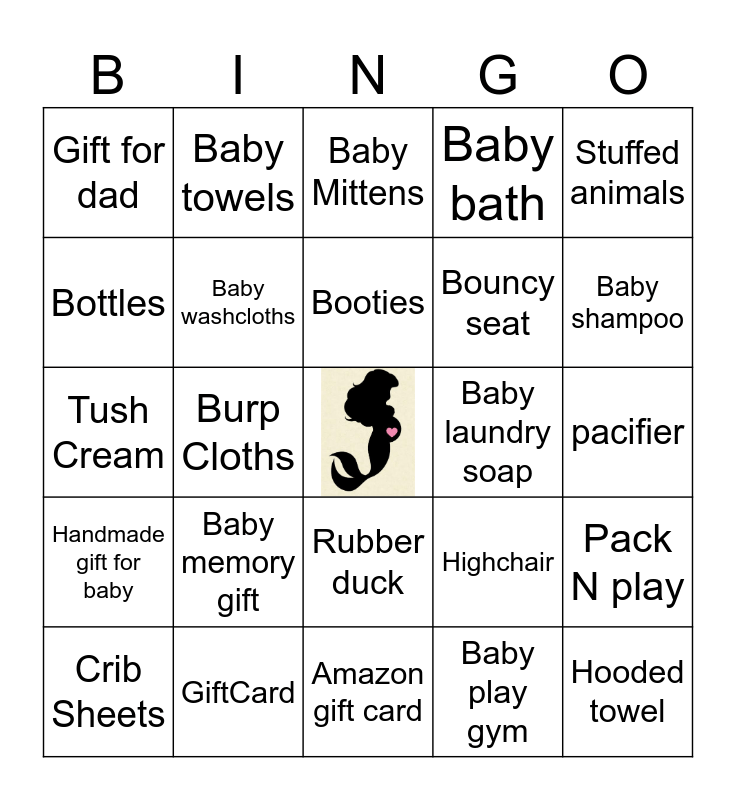 This bingo card has a free space and 74 words: Onesies, Baby Socks, Baby Mittens, Hat, Headband, Hair bow, Bibs, Swaddle blanket, Crib Sheets, Sleepers, Sleep sack, Receiving blankets, Booties, Bottles, Pacifiers, Burp Cloths, Bottle Warmer, Baby shampoo, Baby lotion, Tush Cream, Baby washcloths, Baby towels, Baby bath, Grooming kit, Hooded towel, Changing pad, Nightlight, Sleep noise machine, Baby monitor, Mobile, Stuffed animals, Soft toys, Board books, Musical toy, Teething toys, Baby play gym, Car sear, Stroller, Baby carrier, Travel accessories, Amazon gift card, GiftCard, Personalized gift, Milestone blanket, Gift for mom, Gift for dad, Sibling gift, Baby memory gift, Handmade gift for mom, Gift from registry, Gift NOT on the registry, Baby camping item, pacifier, Diaper bag, Photo frame, Pacifier clip, Rubber duck, Bath toys, Ariel toy, Pack N play, Bouncy seat, Carseat accessories, Handmade gift for baby, Little Mermaid gift, Baby laundry soap, Mermaid outfit, Baby food maker, Teething toys, Highchair, Wipes, Diapers, Pajamas, Bottle rack and Playmat.