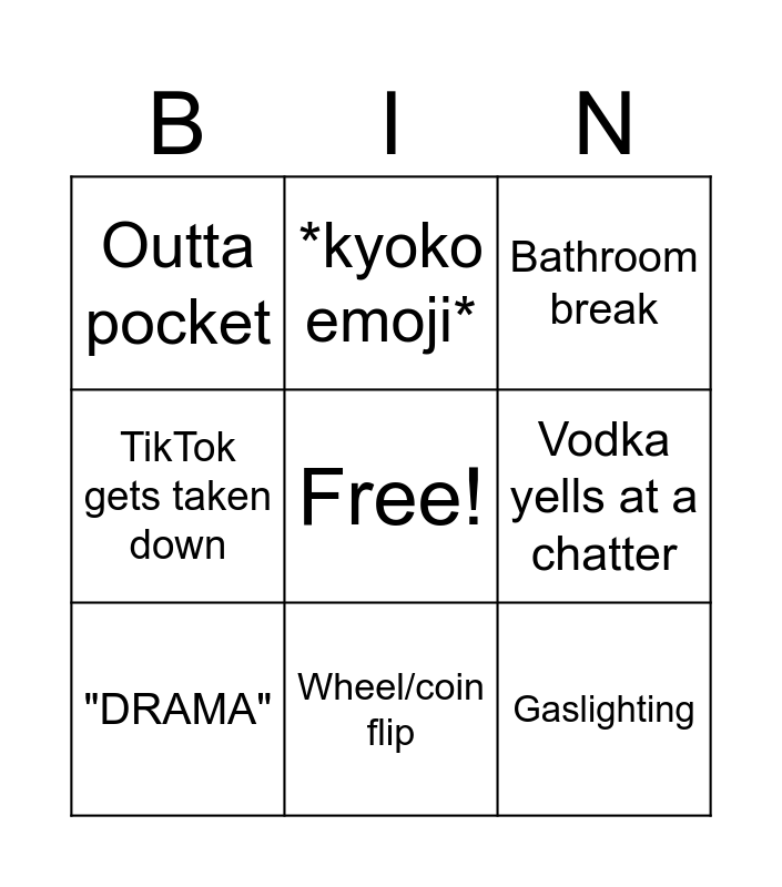This bingo card has a free space and 8 words: TikTok gets taken down, *kyoko emoji*, Vodka yells at a chatter, "DRAMA", Bathroom break, Outta pocket, Wheel/coin flip and Gaslighting.