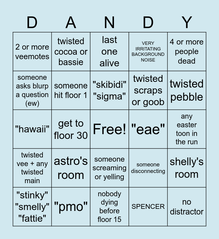 This bingo card has a free space and 31 words: nobody dying before floor 15, Twisted Main on Easter Floor, get to floor 30, get to floor 20, 2 or more veemotes, last one alive, someone hit floor 1, someone disconnecting, "eae", SPENCER, any easter toon in the run, no distractor, get to floor 10, heal card used before floor 20, twisted pebble, 3 or more people talking, shelly's room, astro's room, twisted vee + any twisted main, someone screaming or yelling, 4 or more people dead, more than one of the same toon in a run, "stinky" "smelly" "fattie", twisted cocoa or bassie, twisted scraps or goob, someone asks blurp a question (ew), VERY IRRITATING BACKGROUND NOISE, "hawaii", "pmo", "skibidi" "sigma" and dandy sells heal first 1-5 floors.