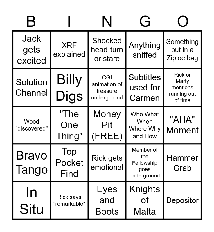This bingo card has a free space and 24 words: Top Pocket Find, Rick says "remarkable", CGI animation of treasure underground, In Situ, Something put in a Ziploc bag, Jack gets excited, Solution Channel, XRF explained, Who What When Where Why and How, Rick gets emotional, Subtitles used for Carmen, Wood "discovered", Member of the Fellowship goes underground, Hammer Grab, Billy Digs, Knights of Malta, "AHA" Moment, Shocked head-turn or stare, Rick or Marty mentions running out of time, "The One Thing", Depositor, Bravo Tango, Anything sniffed and Eyes and Boots.