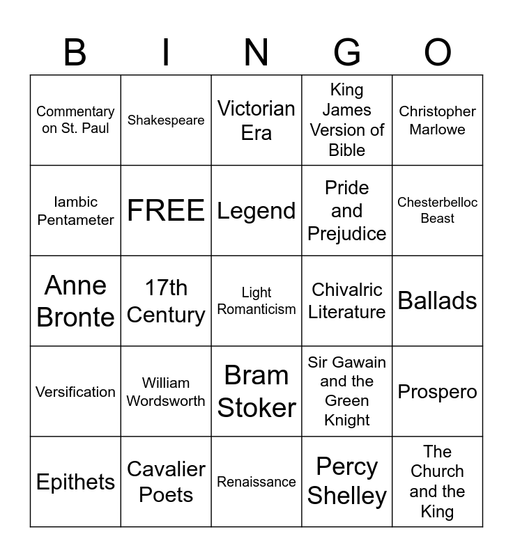 This bingo card has 73 words: Beowulf, Venerable Bede, Commentary on St. Paul, Narrative Poetry, Epic Poetry, Alliteration, Versification, Le Morte d'Arthur, Sir Gawain and the Green Knight, The Canterbury Tales, The Church and the King, Lyrics, FREE, Ballads, Sonnet, Shakespeare, Renaissance, Iambic Pentameter, Geoffrey Chaucer, Chivalric Literature, Legend, King James Version of Bible, Christopher Marlowe, Edmund Spenser, Epithets, Spenserian Stanza, Samuel Pepys’ Diary, The Pilgrim’s Progress, Metaphysical Poets, John Milton, Cavalier Poets, The Tatler and the Spectator, Gulliver's Travels, 18th Century, 17th Century, Romantic Era, Romanticism, Dark Romaticism, Light Romanticism, John Keats, Percy Shelley, William Wordsworth, Samuel Coleridge, Mary Shelley, Jane Austen, Pride and Prejudice, Victorian Era, Charlotte Bronte, Emily Bronte, Anne Bronte, Robert Louis Stevenson, Rudyard Kipling, Oscar Wilde, John Henry Newman, George Eliot, Lewis Carroll, Christina Rossetti, Bram Stoker, Charles Dickens, Gothic Literature, Oxford Movement, Hillaire Belloc, GK Chesterton, Chesterbelloc Beast, George Bernard Shaw, Tractarians, Modernism, Elizabethan Period, Prospero, Frankenstein, Metaphysical Poetry, Realism and 5 Act Play Composition.
