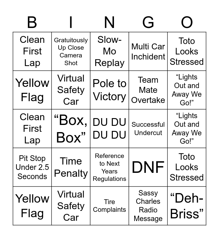 This bingo card has a free space and 49 words: Safety Car Deployed, Time Penalty, Tire Complaints, Sassy Charles Radio Message, “Lights Out and Away We Go!”, Pit Stop Under 2.5 Seconds, Gratuitously Up Close Camera Shot, Someone Swears on Radio, Team Mate Overtake, “Deh-Briss”, Yellow Flag, “Box, Box”, DNF, Toto Looks Stressed, Lando Does Something Annoying, Speculation About Team Changes, Slow-Mo Replay, Successful Undercut, Pit Lane Mess Up, Clean First Lap, Virtual Safety Car, Reference to Next Years Regulations, Multi Car Inchident, Pole to Victory, Safety Car Deployed, Time Penalty, Tire Complaints, Sassy Charles Radio Message, “Lights Out and Away We Go!”, Pit Stop Under 2.5 Seconds, Gratuitously Up Close Camera Shot, Someone Swears on Radio, Team Mate Overtake, “Deh-Briss”, Yellow Flag, “Box, Box”, Slow-Mo Replay, DNF, Toto Looks Stressed, Lando Does Something Annoying, Speculation About Team Changes, Reference to Next Years Regulations, Successful Undercut, Pit Lane Mess Up, Clean First Lap, Virtual Safety Car, Pole to Victory, Multi Car Inchident and Corner Lock Up.