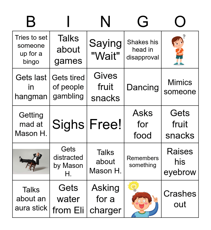 This bingo card has 3 images, a free space and 21 words: Gets distracted by Mason H., Gets water from Eli, Gives fruit snacks, Talks about an aura stick, Tries to set someone up for a bingo, Gets last in hangman, Talks about games, Asks for food, Talks about Mason H., Dancing, Getting mad at Mason H., Remembers something, Raises his eyebrow, Gets tired of people gambling, Gets fruit snacks, Saying "Wait", Mimics someone, Sighs, Crashes out, Shakes his head in disapproval and Asking for a charger.
