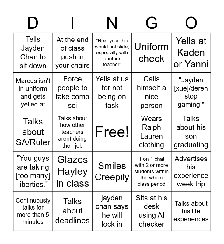 This bingo card has a free space and 24 words: Glazes Hayley in class, Talks about deadlines, Yells at us for not being on task, Continuously talks for more than 5 minutes, Yells at Kaden or Yanni, Tells Jayden Chan to sit down, Marcus isn't in uniform and gets yelled at, At the end of class push in your chairs, Wears Ralph Lauren clothing, Smiles Creepily, Calls himself a nice person, Talks about SA/Ruler, 1 on 1 chat with 2 or more students within the whole class period, Advertises his experience week trip, Force people to take comp sci, Sits at his desk using AI checker, Talks about his son graduating, "Next year this would not slide, especially with another teacher", "Jayden [xue]/deren stop gaming!", Talks about how other teachers arent doing their job, Talks about his life experiences, "You guys are taking [too many] liberties.", Uniform check and jayden chan says he will lock in.