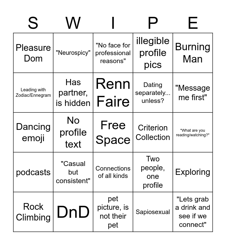 This bingo card has a free space and 24 words: "Casual but consistent", DnD, Renn Faire, Rock Climbing, Burning Man, Pleasure Dom, Leading with Zodiac/Ennegram, "Neurospicy", Criterion Collection, Connections of all kinds, Dating separately... unless?, Dancing emoji, Two people, one profile, Exploring, Has partner, is hidden, Sapiosexual, "What are you reading/watching?", "No face for professional reasons", "Message me first", No profile text, "Lets grab a drink and see if we connect", podcasts, illegible profile pics and pet picture, is not their pet.