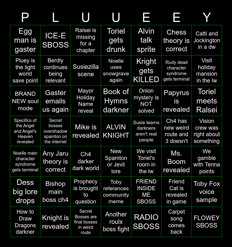 This bingo card has a free space and 48 words: FRIEND INSIDE ME SBOSS, Rudy dead character syndrome gets terminal, Another roulx boss fight, Secret bosses overshadow spamton on the internet, Mayor Holiday Name reveal, Vision crew was right about something, ICE-E SBOSS, Knight is revealed, Chess theory is correct, New Spamton or Jevil lore, Catti and Jockington in a dw, Toriel gets drunk, Papyrus is revealed, Onion mystery is NOT solved, Dess big lore drops, Ch4 has new weird route and 3 doesn't, Pluey is the light world save point, Visit holiday mansion in the lw, Friend Cat is revealed in game, Alvin talk sprite, Kright gets KILLED, Mike is revealed, Egg man is gaster, Berdly continues being relevant, Toby Fox voice sample, Susiezilla scene, Toriel meets Ralsei, How to Draw Dragons darkner, Book of Hymns darkner, Gaster emails us again, Carpet song comes back, Susie learns darkners aren't real people, We gamble with Tenna points, Bishop main boss ch4, Specifics of the Angel and Angel's Heaven revealed, We visit Toriel's room in the lw, Ms. Boom revealed, BRAND NEW soul mode, Ch4 darker dark world, Prophecy is brought to question, Noelle main character syndrome gets terminal, FLOWEY SBOSS, Ralsei is missing for a chapter, Secret Bosses are final bosses in weird route, Noelle uses snowgrave again, Toby references community meme, Any Jaru theory is correct and RADIO SBOSS.