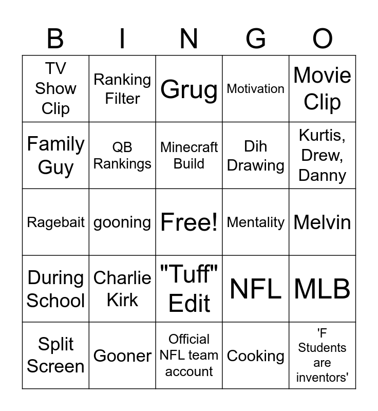 This bingo card has a free space and 24 words: Charlie Kirk, Gooner, Minecraft Build, Split Screen, Movie Clip, TV Show Clip, Family Guy, Ranking Filter, Mentality, "Tuff" Edit, Dih Drawing, Ragebait, NFL, MLB, QB Rankings, Cooking, Melvin, Grug, Kurtis, Drew, Danny, gooning, 'F Students are inventors', During School, Motivation and Official NFL team account.