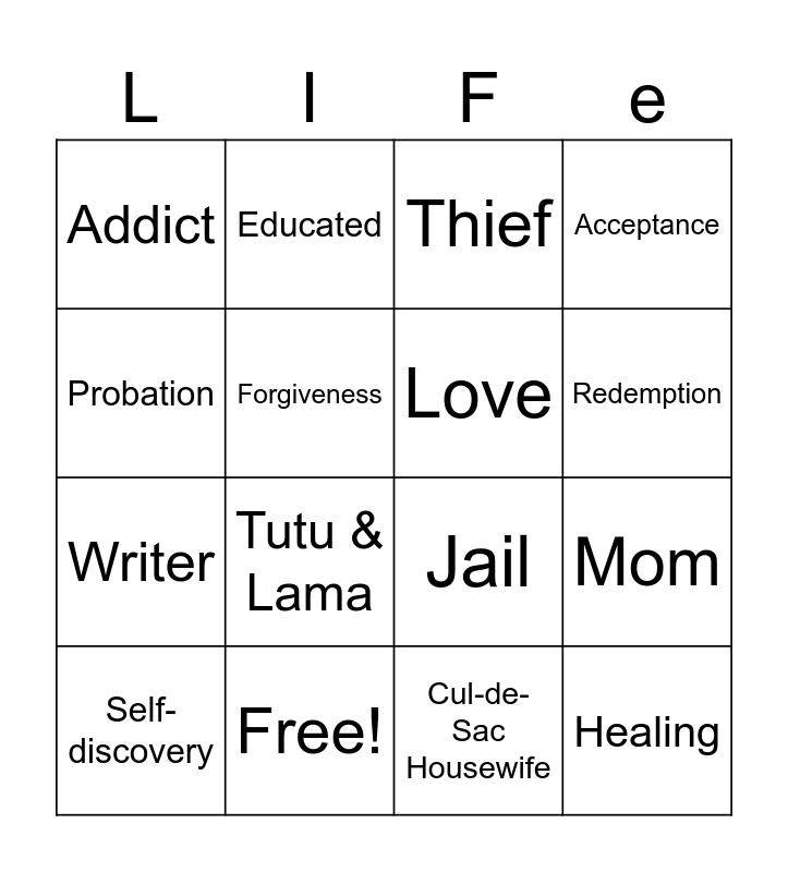 This bingo card has 16 words: Free!, Mom, Thief, Addict, Writer, Educated, Jail, Cul-de-Sac Housewife, Probation, Forgiveness, Self-discovery, Acceptance, Tutu & Lama, Redemption, Love and Healing.
