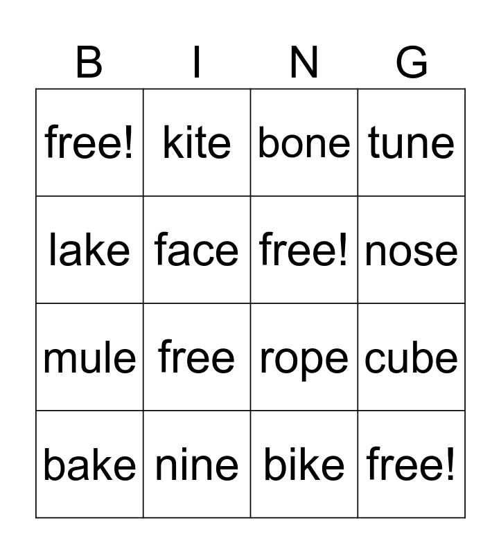 This bingo card has 16 words: bake, nine, bone, tune, lake, kite, rope, cube, free!, face, bike, nose, mule, free, free! and free!.