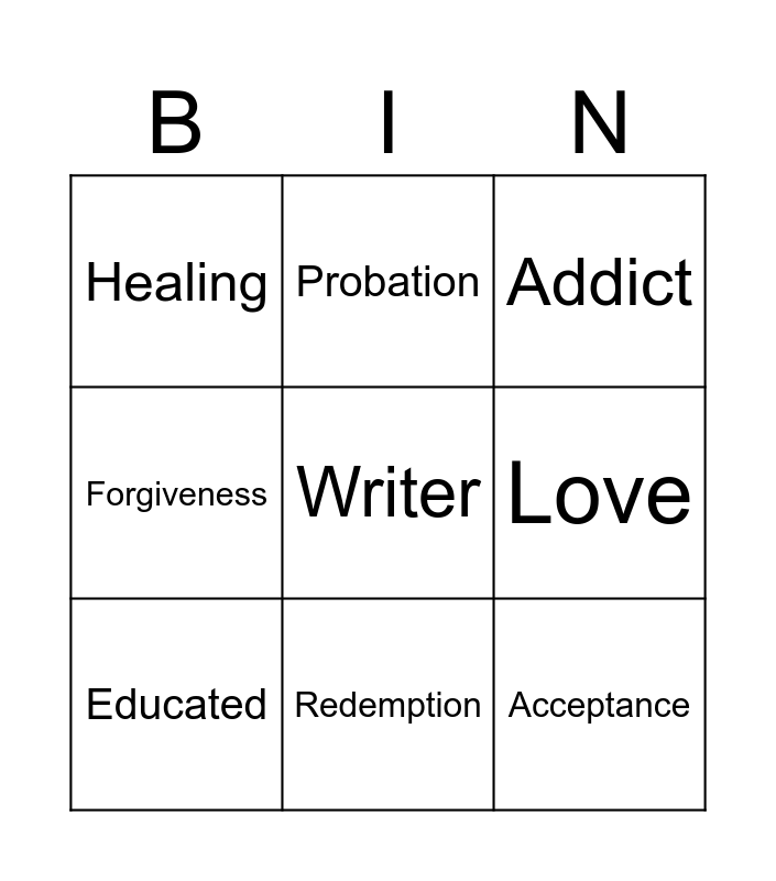This bingo card has 14 words: Self-Discovery, Jail, Educated, Probation, Forgiveness, Writer, Acceptance, Cul-de-Sac Housewife, Redemption, Healing, Mom, Love, Addict and Tutu & Lama.
