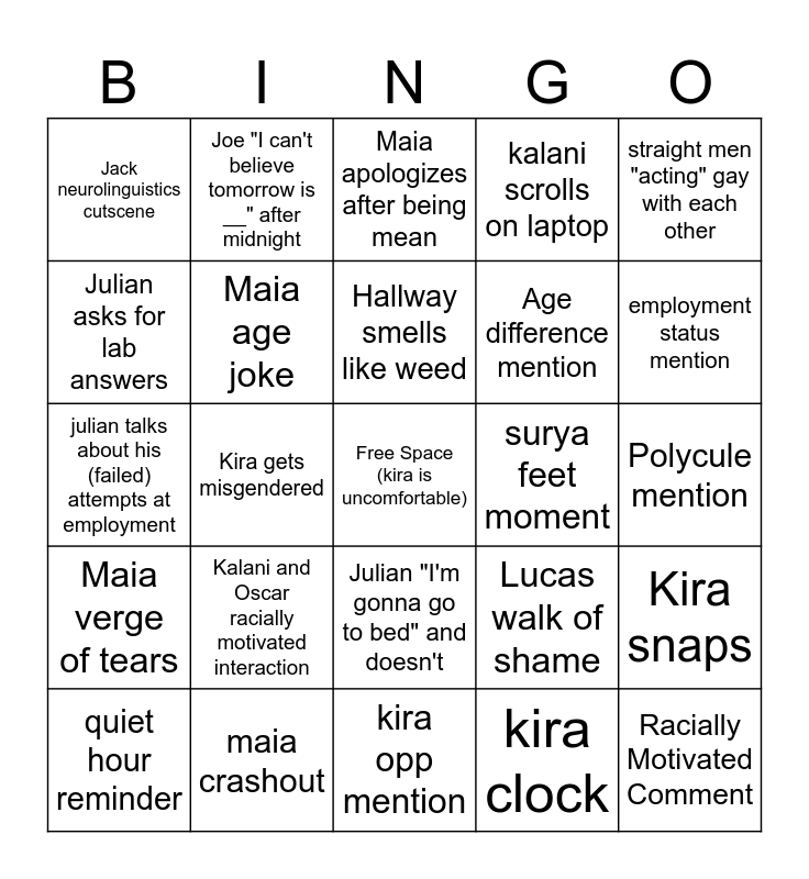 This bingo card has a free space and 68 words: AI Usage, Racially Motivated Comment, Lucas Immune System L, Mucus mention, the giggle/cackle, joe hand gesture, Joe "I can't believe tomorrow is __" after midnight, Kira/Jack becomes an unpaid academic advisor, Hallway smells like weed, "I'm gonna lock in", Julian "I'm gonna go to bed" and doesn't, "So...", Polycule mention, straight men "acting" gay with each other, Kira caffeine intake moment, Julian asks for lab answers, Kira gets misgendered, Jack neurolinguistics cutscene, Omegle, Kalani and Oscar racially motivated interaction, Age difference mention, Lucas walk of shame, Maia verge of tears, Maia random lounge appearance, AI Mention, "I have a friend who is___", tongue click, Redbull mention, Kira snaps, Maia sexually harrasses kira/jack, Maia apologizes after being mean, Jack/Kira sideye, David charisma check, Reel bit mention, kalani scrolls on laptop, julian sends a reel, twin moment, quiet hour reminder, employment status mention, julian talks about his (failed) attempts at employment, twin complaint abt hw, "that's THE kruzz to you", Maia age joke, video game moment, Kira/jack/maia meta the group dynamic, lucas bi allegations, jordan talks about a love interest, surya villain laugh, surya feet moment, maia crashout, kira crashout, jack crashout, successful ragebait, kira opp mention, anyone is cooked for a midterm, ignorance moment, kira clock, kyle enters, gautam "girl", abraham shadowbox/dance, -uzz, lucas melodrama moment, chem moment, pazos complaint, code crashout, panda express mention, "kira is basically our RA" and low battery moment.