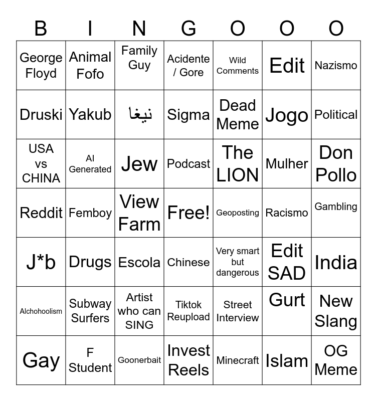 This bingo card has a free space and 48 words: J*b, Femboy, Goonerbait, Chinese, Dead Meme, Racismo, Nazismo, Gay, AI Generated, View Farm, Acidente / Gore, Wild Comments, Mulher, Don Pollo, Reddit, Subway Surfers, Family Guy, Podcast, Street Interview, Edit, Political, Druski, Animal Fofo, نيغا, Minecraft, Jogo, Gambling, Alchohoolism, Drugs, Jew, Tiktok Reupload, The LION, Gurt, New Slang, George Floyd, F Student, Escola, Invest Reels, Geoposting, Islam, India, USA vs CHINA, Yakub, Artist who can SING, Sigma, Very smart but dangerous, Edit SAD and OG Meme.