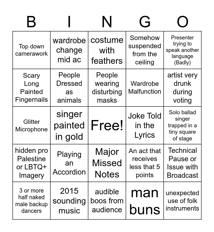 This bingo card has a free space and 24 words: Playing an Accordion, 2015 sounding music, People wearing disturbing masks, 3 or more half naked male backup dancers, Presenter trying to speak another language (Badly), Top down camerawork, Scary Long Painted Fingernails, wardrobe change mid ac, Joke Told in the Lyrics, Major Missed Notes, Wardrobe Malfunction, Glitter Microphone, An act that receives less that 5 points, Technical Pause or Issue with Broadcast, People Dressed as animals, man buns, Solo ballad singer trapped in a tiny square of stage, costume with feathers, artist very drunk during voting, singer painted in gold, unexpected use of folk instruments, hidden pro Palestine or LBTQ+ Imagery, Somehow suspended from the ceiling and audible boos from audience.