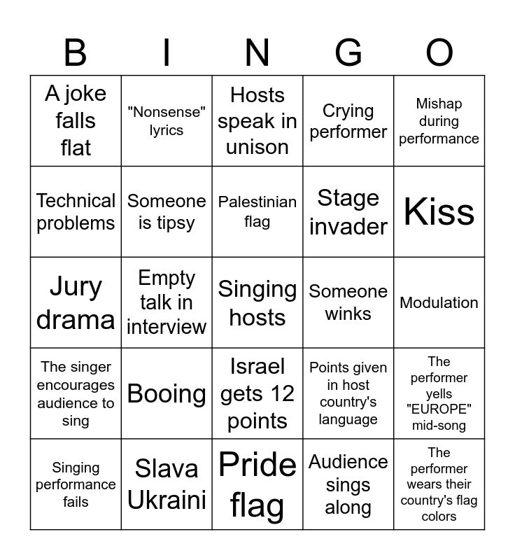 This bingo card has 25 words: Booing, Pride flag, Palestinian flag, Singing performance fails, Mishap during performance, A joke falls flat, Technical problems, "Nonsense" lyrics, Someone winks, Israel gets 12 points, Stage invader, Jury drama, Points given in host country's language, The performer yells "EUROPE" mid-song, Someone is tipsy, The performer wears their country's flag colors, Modulation, Hosts speak in unison, Kiss, Empty talk in interview, Singing hosts, Slava Ukraini, The singer encourages audience to sing, Crying performer and Audience sings along.