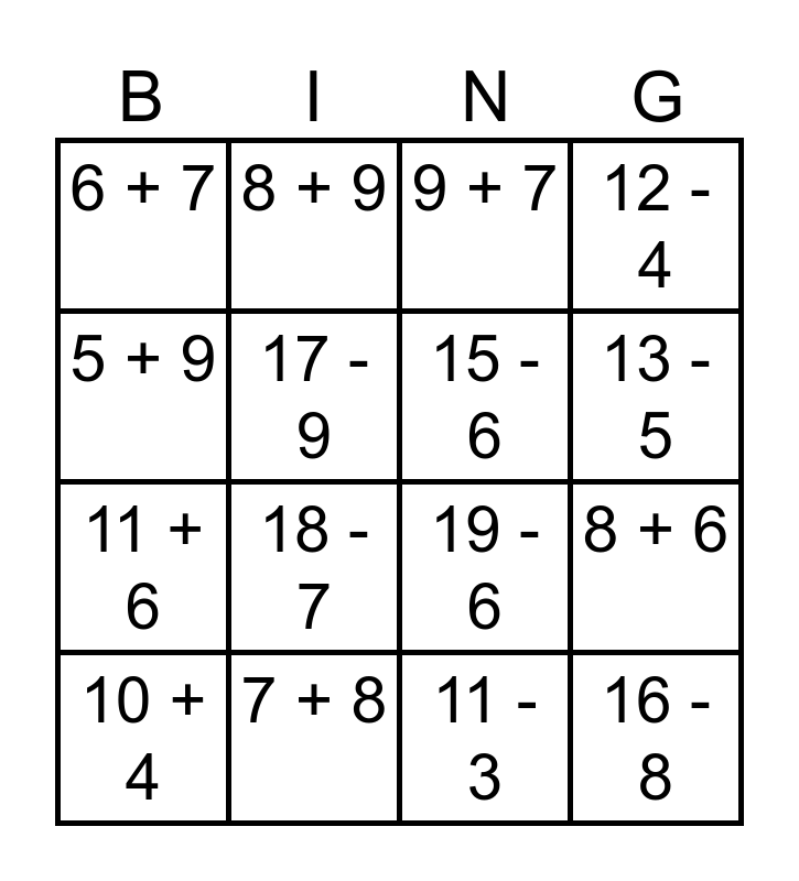 This bingo card has 20 words: 8 + 6, 7 + 5, 9 + 7, 6 + 8, 10 + 4, 5 + 9, 7 + 8, 6 + 7, 11 + 6, 8 + 9, 18 - 7, 19 - 6, 17 - 9, 16 - 8, 15 - 6, 14 - 7, 13 - 5, 12 - 4, 11 - 3 and 10 - 2.