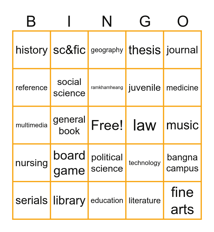 This bingo card has a free space and 30 words: library, book, general book, philosophy, history, geography, social science, political science, law, education, music, fine arts, literature, science, medicine, agriculture, technology, nursing, board game, journal, multimedia, reserve, sc&fic, juvenile, reference, thesis, bangna campus, serials, ramkhamheang and bangna library.
