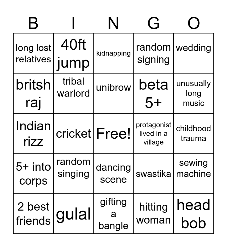 This bingo card has a free space and 37 words: henna, Indian hacker, Indian hacker, tribal warlord, sewing machine, random singing, unibrow, finger food, wedding, 80's, cricket, random signing, head bob, childhood trauma, britsh raj, 5+ into corps, corrupt cops, kidnapping, dancing scene, protagonist lived in a village, long lost relatives, unusually long music, 2 best friends, gifting a bangle, super Indian, hitting woman, 40ft jump, "i will die for you", 3+ Indian flags, feet, one hit 3 kills, gulal, Indian rizz, terrorism, swastika, beta 5+ and \.
