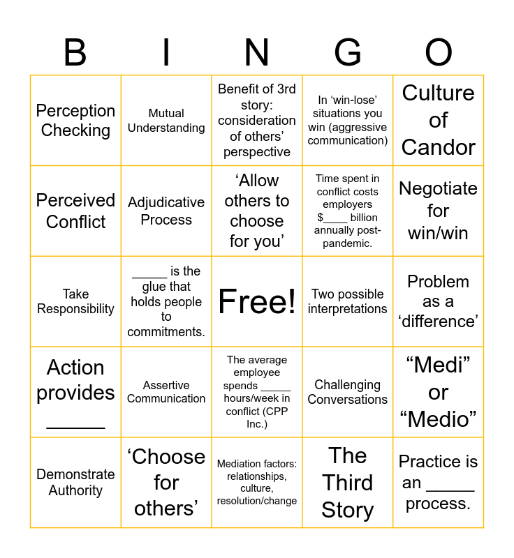 This bingo card has a free space and 24 words: Assertive Communication, ‘Choose for others’, ‘Allow others to choose for you’, Demonstrate Authority, Culture of Candor, Perception Checking, Perceived Conflict, Mutual Understanding, Two possible interpretations, The average employee spends _____ hours/week in conflict (CPP Inc.), Time spent in conflict costs employers $____ billion annually post-pandemic., Take Responsibility, Challenging Conversations, “Medi” or “Medio”, Adjudicative Process, The Third Story, Problem as a ‘difference’, Benefit of 3rd story: consideration of others’ perspective, Negotiate for win/win, _____ is the glue that holds people to commitments., Practice is an _____ process., Action provides _____, In ‘win-lose’ situations you win (aggressive communication) and Mediation factors: relationships, culture, resolution/change.
