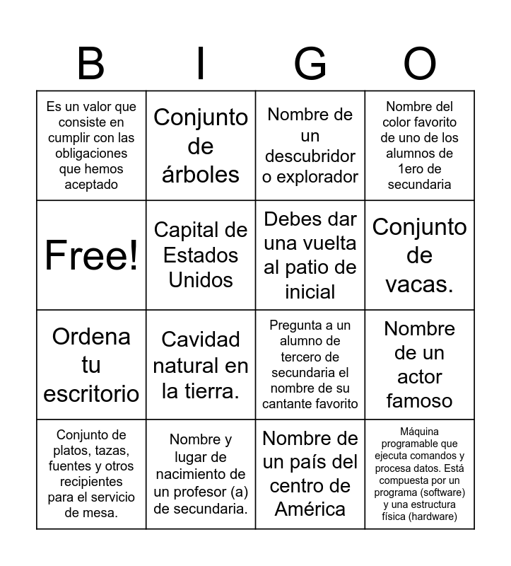 This bingo card has 16 words: Nombre y lugar de nacimiento de un profesor (a) de secundaria., Nombre de un actor famoso, Nombre de un descubridor o explorador, Es un valor que consiste en cumplir con las obligaciones que hemos aceptado, Ordena tu escritorio, Conjunto de árboles, Pregunta a un alumno de tercero de secundaria el nombre de su cantante favorito, Nombre de un país del centro de América, Free!, Capital de Estados Unidos, Conjunto de platos, tazas, fuentes y otros recipientes para el servicio de mesa., Nombre del color favorito de uno de los alumnos de 1ero de secundaria, Cavidad natural en la tierra., Conjunto de vacas., Debes dar una vuelta al patio de inicial and Máquina programable que ejecuta comandos y procesa datos. Está compuesta por un programa (software) y una estructura física (hardware).