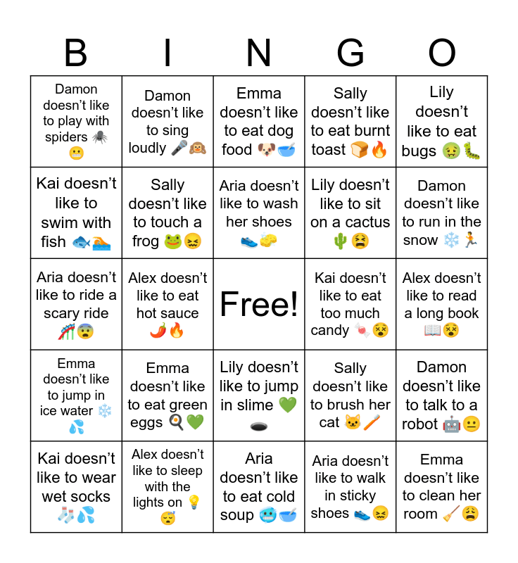 This bingo card has a free space and 33 words: Kai doesn’t like to eat worms 😖🤢, Damon doesn’t like to play with mud, Alex doesn’t like to eat hot sauce 🌶️🔥, Aria doesn’t like to hug a bear 🐻😱, Emma doesn’t like to jump in ice water ❄️💦, Sally doesn’t like to touch a frog 🐸😖, Lily doesn’t like to eat bugs 🤢🐛, Kai doesn’t like to wear wet socks 🧦💦, Damon doesn’t like to sing loudly 🎤🙉, Alex doesn’t like to eat a lemon 🍋😣, Aria doesn’t like to wash her shoes 👟🧽, Emma doesn’t like to eat dog food 🐶🥣, Sally doesn’t like to dance in the rain 🌧️💃, Lily doesn’t like to drink pickle juice 🥒🥤, Kai doesn’t like to eat too much candy 🍬😵, Damon doesn’t like to run in the snow ❄️🏃, Alex doesn’t like to sleep with the lights on 💡😴, Aria doesn’t like to ride a scary ride 🎢😨, Emma doesn’t like to eat green eggs 🍳💚, Sally doesn’t like to brush her cat 🐱🪥, Lily doesn’t like to jump in slime 💚🕳️, Kai doesn’t like to wear a big hat 🎩🙅♂️, Damon doesn’t like to play with spiders 🕷️😬, Alex doesn’t like to read a long book 📖😵, Aria doesn’t like to eat cold soup 🥶🥣, Emma doesn’t like to clean her room 🧹😩, Sally doesn’t like to eat burnt toast 🍞🔥, Lily doesn’t like to sit on a cactus 🌵😫, Kai doesn’t like to swim with fish 🐟🏊, Damon doesn’t like to talk to a robot 🤖😐, Alex doesn’t like to eat ice cream fast 🍦🥶, Aria doesn’t like to walk in sticky shoes 👟😖 and Emma doesn’t like to carry heavy bags 👜😣.