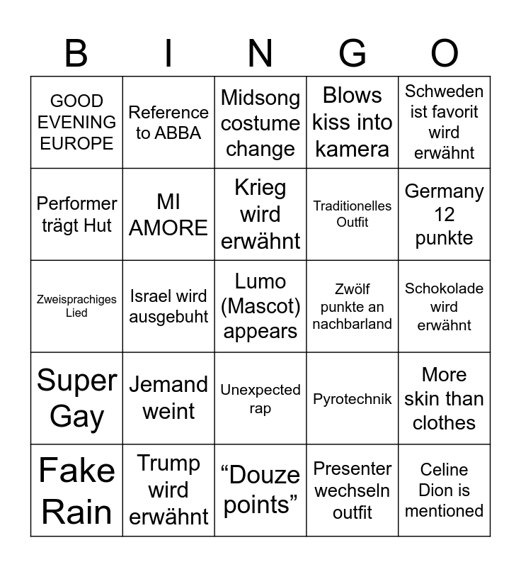 This bingo card has 45 words: „Eurovision is nicht politisch“, Lumo (Mascot) appears, Katzen schlagen fernseher, Fake Rain, Flagge im Gesicht im Publikum, Presenter wechseln outfit, Midsong costume change, Schweizer neutralität wird erwähnt, Schweden ist favorit wird erwähnt, Trump wird erwähnt, Blows kiss into kamera, Zwölf punkte an nachbarland, Unexpected rap, Jemand weint, Saxophon, “Douze points”, Auffällig fake instrument gespielt (playback), Zweisprachiges Lied, UK 12 punkte, Germany 12 punkte, Reference to ABBA, Windmaschine läuft, Teilnehmer in Flagge gewickelt, GOOD EVENING EUROPE, GRÜTZI, Schokolade wird erwähnt, Käse wird erwähnt, Performer liegt am Boden, Pyrotechnik, Super Gay, Glitter, More skin than clothes, Is this a dance show, Getting sexual on stage, Boring ballade, Israel wird ausgebuht, Bad singing, Hazel do cringe, Celine Dion is mentioned, Krieg wird erwähnt, Performer trägt Hut, Traditionelles Outfit, Kein Standardinstrument, MI AMORE and Performer verkackt.