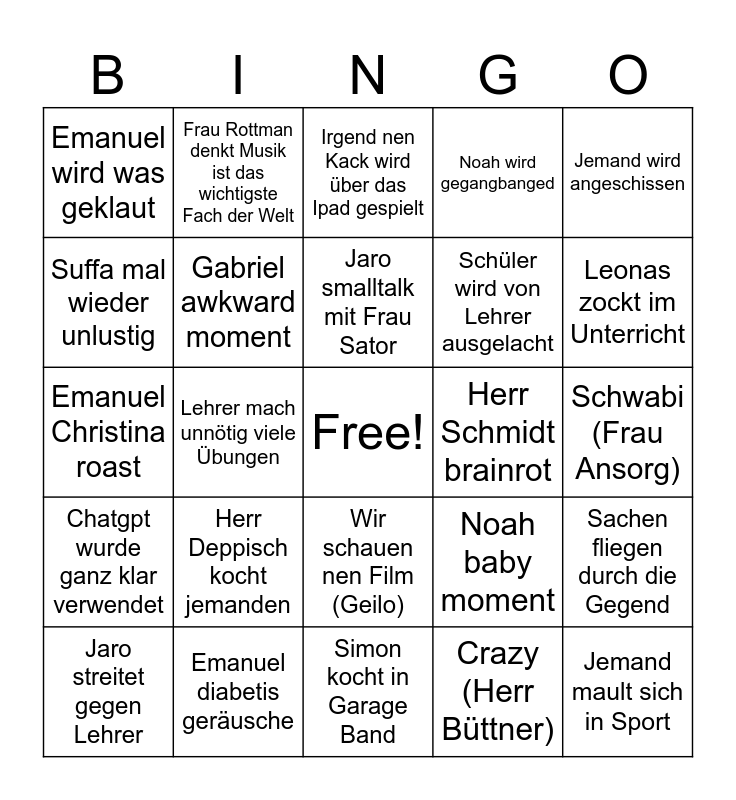 This bingo card has a free space and 24 words: Herr Deppisch kocht jemanden, Emanuel diabetis geräusche, Jaro smalltalk mit Frau Sator, Jaro streitet gegen Lehrer, Jemand wird angeschissen, Emanuel wird was geklaut, Suffa mal wieder unlustig, Frau Rottman denkt Musik ist das wichtigste Fach der Welt, Herr Schmidt brainrot, Wir schauen nen Film (Geilo), Schüler wird von Lehrer ausgelacht, Emanuel Christina roast, Noah baby moment, Sachen fliegen durch die Gegend, Gabriel awkward moment, Crazy (Herr Büttner), Schwabi (Frau Ansorg), Irgend nen Kack wird über das Ipad gespielt, Leonas zockt im Unterricht, Lehrer mach unnötig viele Übungen, Jemand mault sich in Sport, Chatgpt wurde ganz klar verwendet, Noah wird gegangbanged and Simon kocht in Garage Band.