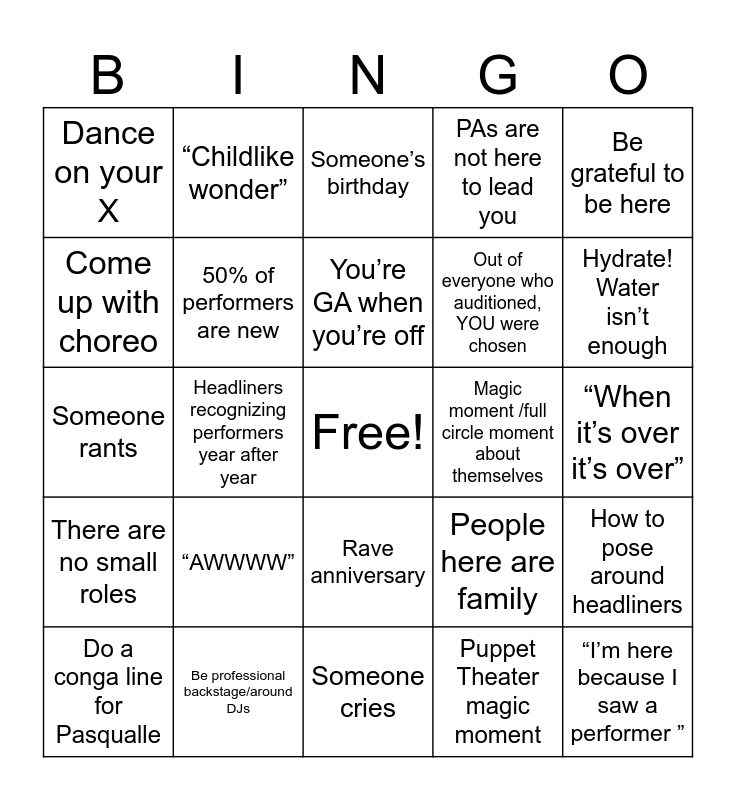 This bingo card has a free space and 24 words: “AWWWW”, Be professional backstage/around DJs, You’re GA when you’re off, Do a conga line for Pasqualle, Be grateful to be here, Dance on your X, Come up with choreo, “Childlike wonder”, Magic moment /full circle moment about themselves, Rave anniversary, Out of everyone who auditioned, YOU were chosen, Someone rants, People here are family, How to pose around headliners, 50% of performers are new, Puppet Theater magic moment, “When it’s over it’s over”, Someone’s birthday, Hydrate! Water isn’t enough, Headliners recognizing performers year after year, “I’m here because I saw a performer ”, There are no small roles, PAs are not here to lead you and Someone cries.