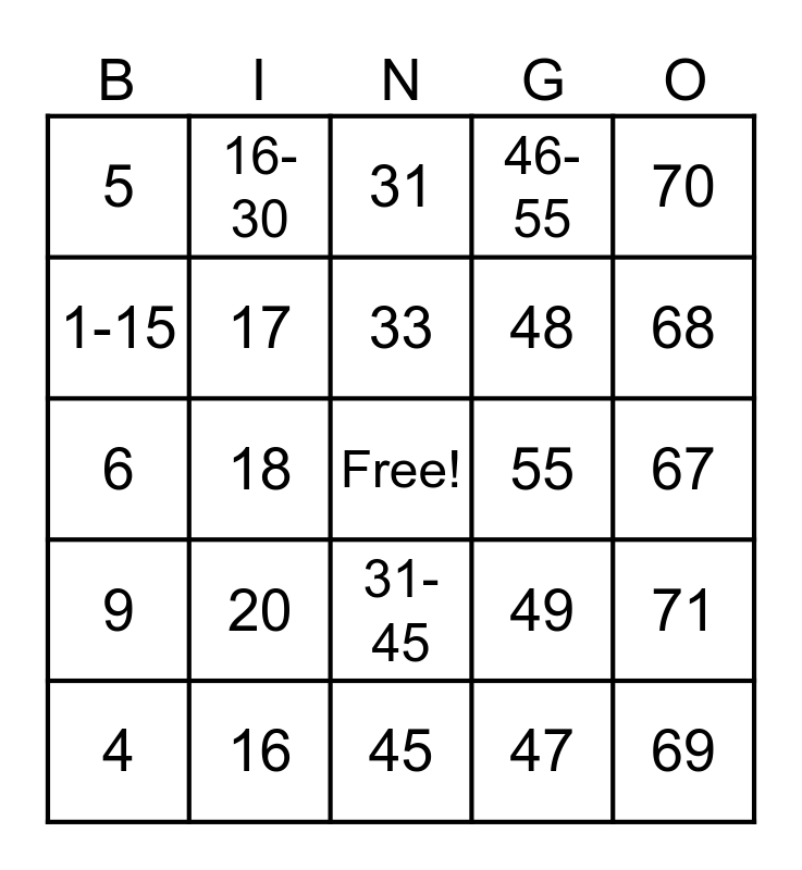This bingo card has a free space and 29 words: 1, 16, 31, 46, 70, 5, 17, 33, 55, 71, 4, 18, 47, 69, 6, 19, 45, 49, 68, 9, 20, 44, 48, 67, 1-15, 16-30, 31-45, 46-55 and 56-75.