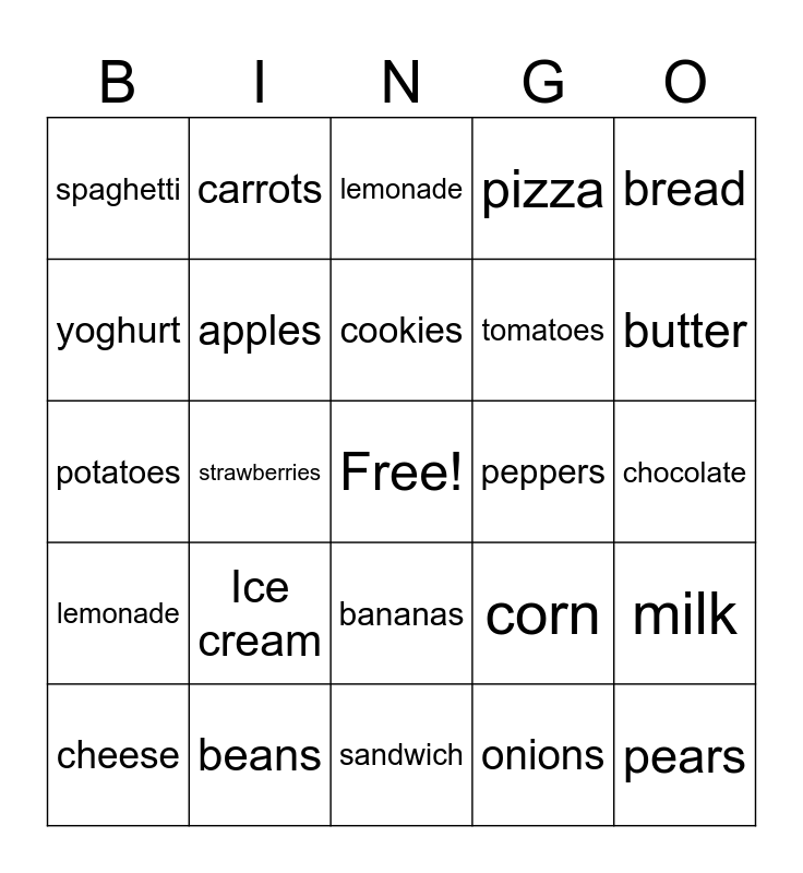 This bingo card has a free space and 24 words: Ice cream, beans, cookies, cheese, bread, spaghetti, yoghurt, carrots, peppers, bananas, tomatoes, potatoes, corn, milk, apples, onions, chocolate, lemonade, butter, strawberries, pears, lemonade, pizza and sandwich.