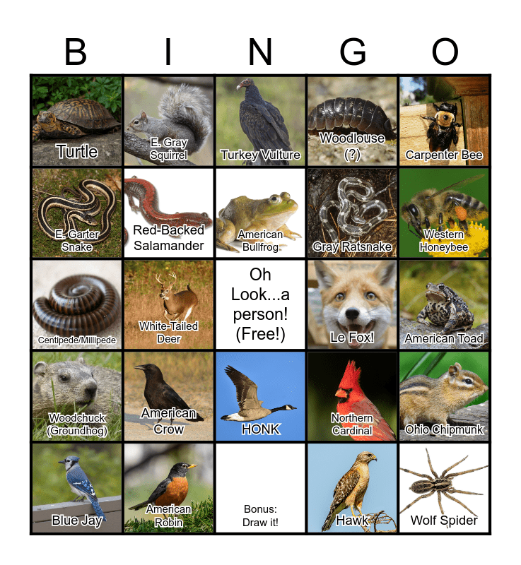 This bingo card has 23 images, a free space and 24 words: American Crow, American Robin, American Bullfrog, Blue Jay, Carpenter Bee, Turtle, E. Garter Snake, E. Gray Squirrel, Le Fox!, HONK, Gray Ratsnake, Centipede/Millipede, Northern Cardinal, Ohio Chipmunk, Red-Backed Salamander, Hawk, American Toad, Turkey Vulture, Western Honeybee, White-Tailed Deer, Wolf Spider, Woodchuck (Groundhog), Woodlouse (?) and Bonus: Draw it!.
