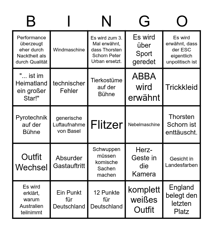 This bingo card has 35 words: ist im Heimatland ein großer Star, Song, in dem mindestens zwei Sprachen vorkommen, Politische Nachricht, ABBA wird erwähnt, England belegt den letzten Platz, Performance überzeugt eher durch Nacktheit als durch Qualität, technischer Fehler, Jemand macht eine Herzgeste in die Kamera, Nebelmaschine, Tierkostüme auf der Bühne, Pyrotechnik auf der Bühne, Windmaschine, Schwuppen müssen komische Sachen machen, Jemand ist barfuß, Es wird erwähnt, dass der ESC eigentlich unpolitisch ist, Outfit Wechsel, Ein Punkt für Deutschland, Es wird zum 3. Mal erwähnt, dass Thorsten Schorn Peter Urban ersetzt., komplett weißes Outfit, Thorsten Schorn ist enttäuscht., Es wird erklärt, warum Australien teilnimmt, generische Luftaufnahme von Basel, Flitzer, Epic Blasinstrument-Solo, Trickkleid, "... ist im Heimatland ein großer Star!", Pyrotechnik auf der Bühne, 12 Punkte für Deutschland, Herz-Geste in die Kamera, Gesicht in Landesfarben, Es wird eine Burg gezeigt, Absurder Gastauftritt, Tierkostüme auf der Bühne, Es wird über Sport geredet and Es wird erklärt, warum Australien teilnimmt.
