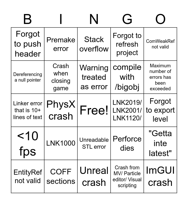 This bingo card has a free space and 24 words: LNK1000, COFF sections, Warning treated as error, EntityRef not valid, ComWeakRef not valid, Forgot to push header, Dereferencing a null pointer, Premake error, LNK2019/ LNK2001/ LNK1120/, Unreadable STL error, compile with /bigobj, Linker error that is 10+ lines of text, Perforce dies, "Getta inte latest", Crash when closing game, Crash from MV/ Particle editor/ Visual scripting, Forgot to export level, Stack overflow, Maximum number of errors has been exceeded, PhysX crash, ImGUI crash, <10 fps, Forgot to refresh project and Unreal crash.