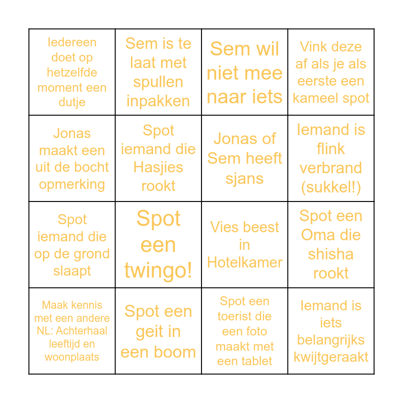 This bingo card has 16 words: Spot een geit in een boom, Spot een Oma die shisha rookt, Sem wil niet mee naar iets, Iedereen doet op hetzelfde moment een dutje, Spot iemand die op de grond slaapt, Sem is te laat met spullen inpakken, Vies beest in Hotelkamer, Spot een toerist die een foto maakt met een tablet, Jonas maakt een uit de bocht opmerking, Spot iemand die Hasjies rookt, Maak kennis met een andere NL: Achterhaal leeftijd en woonplaats, Vink deze af als je als eerste een kameel spot, Spot een twingo!, Iemand is flink verbrand (sukkel!), Jonas of Sem heeft sjans and Iemand is iets belangrijks kwijtgeraakt.
