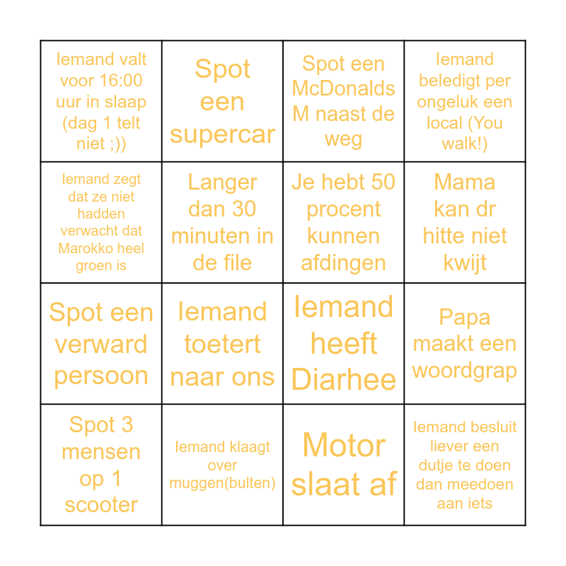 This bingo card has 16 words: Iemand klaagt over muggen(bulten), Papa maakt een woordgrap, Spot een McDonalds M naast de weg, Iemand valt voor 16:00 uur in slaap (dag 1 telt niet ;)), Spot een verward persoon, Spot een supercar, Iemand heeft Diarhee, Motor slaat af, Iemand zegt dat ze niet hadden verwacht dat Marokko heel groen is, Langer dan 30 minuten in de file, Spot 3 mensen op 1 scooter, Iemand beledigt per ongeluk een local (You walk!), Iemand toetert naar ons, Mama kan dr hitte niet kwijt, Je hebt 50 procent kunnen afdingen and Iemand besluit liever een dutje te doen dan meedoen aan iets.