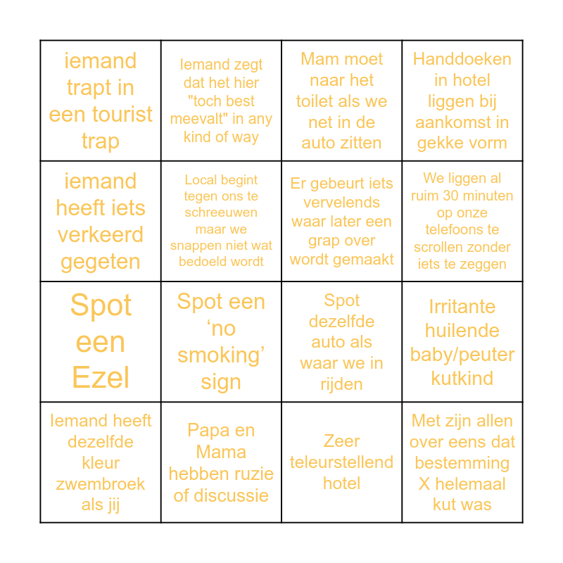 This bingo card has 16 words: Papa en Mama hebben ruzie of discussie, Irritante huilende baby/peuter kutkind, Mam moet naar het toilet als we net in de auto zitten, iemand trapt in een tourist trap, Spot een Ezel, Iemand zegt dat het hier "toch best meevalt" in any kind of way, Spot dezelfde auto als waar we in rijden, Zeer teleurstellend hotel, iemand heeft iets verkeerd gegeten, Local begint tegen ons te schreeuwen maar we snappen niet wat bedoeld wordt, Iemand heeft dezelfde kleur zwembroek als jij, Handdoeken in hotel liggen bij aankomst in gekke vorm, Spot een ‘no smoking’ sign, We liggen al ruim 30 minuten op onze telefoons te scrollen zonder iets te zeggen, Er gebeurt iets vervelends waar later een grap over wordt gemaakt and Met zijn allen over eens dat bestemming X helemaal kut was.