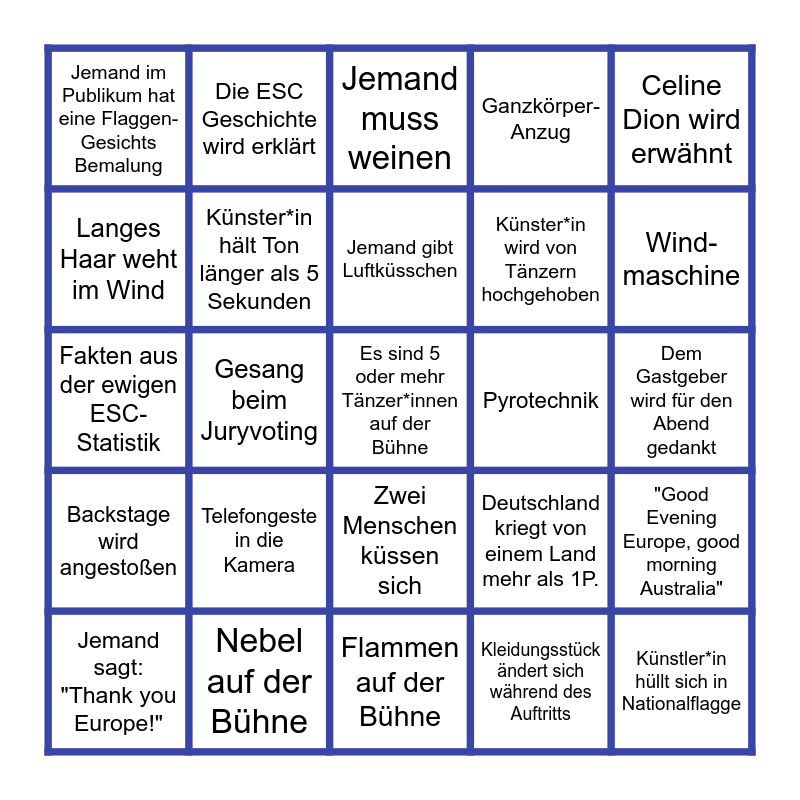 This bingo card has a free space and 44 words: Moderatorin hat sich umgezogen, Künstler*in hüllt sich in Nationalflagge, Traditionelles Kostüm / Tracht, Jemand sagt: "Thank you Europe!", Sänger*in spielt selber ein Instrument, Kleidungsstück ändert sich während des Auftritts, Jemand muss weinen, Handherzen für die Zuschauer, Celine Dion wird erwähnt, Nebel auf der Bühne, Ganzkörper- Anzug, Pyrotechnik, Zwei Menschen küssen sich, Telefongeste in die Kamera, Hinweis auf einen Act, der im Halbfinale ausgeschieden ist, Flammen auf der Bühne, Jemand sagt "Grand Prix", Fakten aus der ewigen ESC-Statistik, Nachbarländer schieben sich Punkte zu, Wind-maschine, Die ESC Geschichte wird erklärt, Jemand sagt etwas Sexistisches, Akrobatik auf der Bühne, Jemand im Publikum hat eine Flaggen- Gesichts Bemalung, Sänger*in trifft den Ton nicht, Dem Gastgeber wird für den Abend gedankt, Instrumente werden offensichtlich Playback gespielt, Jemand bedankt sich in 2 Sprachen, Deutschland kriegt von einem Land mehr als 1P., Backstage wird angestoßen, Es wird gejodelt, "Good Evening Europe, good morning Australia", Sänger/in ist Barfuß, Technischer Fehler, Gesang beim Juryvoting, Der Eiffelturm wird gezeigt, Awkward High-Five, Fondue wird erwähnt, Jemand gibt Luftküsschen, Langes Haar weht im Wind, Künster*in wird von Tänzern hochgehoben, Publikum wird Lichtermeer, Künster*in hält Ton länger als 5 Sekunden and Künster*in zeigt Startnummer in Kamera.