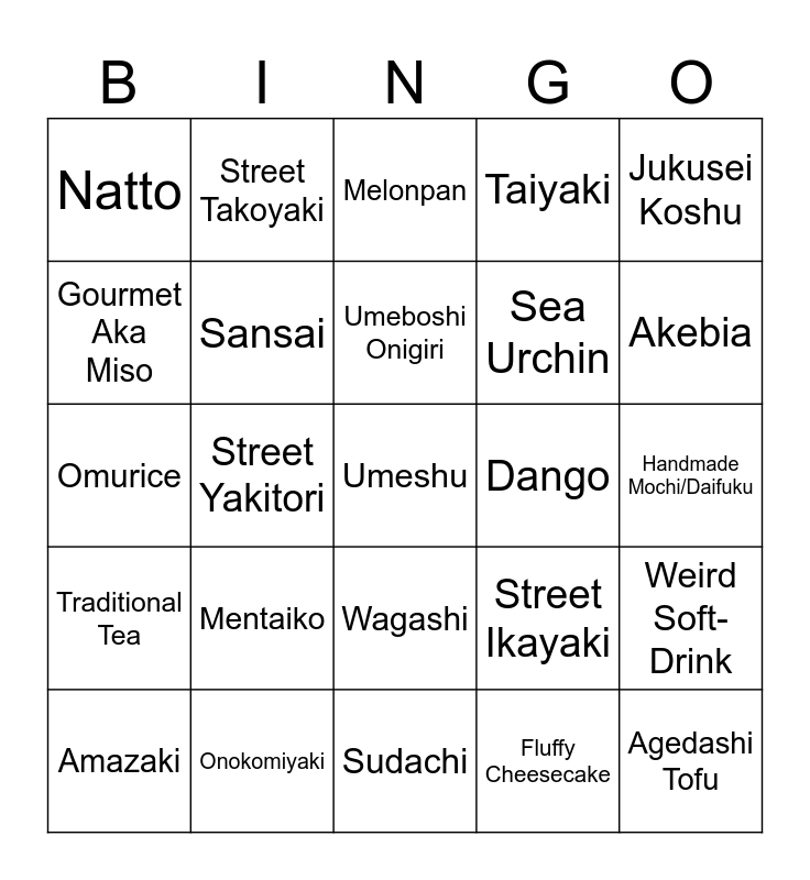 This bingo card has 25 words: Mentaiko, Sudachi, Umeboshi Onigiri, Amazaki, Jukusei Koshu, Natto, Gourmet Aka Miso, Street Takoyaki, Dango, Wagashi, Sea Urchin, Omurice, Street Ikayaki, Weird Soft-Drink, Sansai, Agedashi Tofu, Handmade Mochi/Daifuku, Melonpan, Akebia, Street Yakitori, Umeshu, Onokomiyaki, Traditional Tea, Taiyaki and Fluffy Cheesecake.