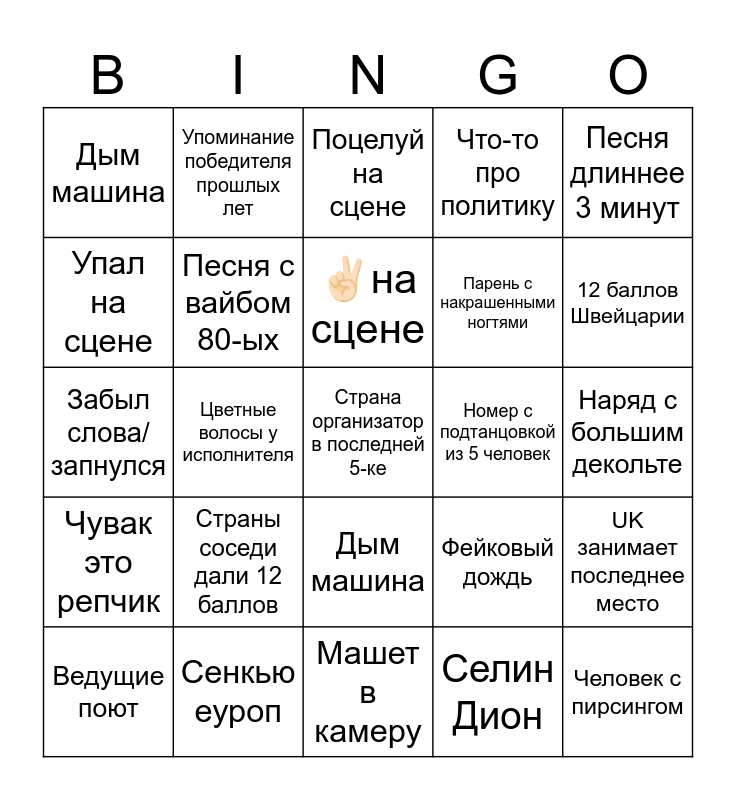 This bingo card has a free space and 24 words: Страны соседи дали 12 баллов, Сенкью еуроп, ✌🏻на сцене, Ведущие поют, Песня длиннее 3 минут, Дым машина, Упал на сцене, Упоминание победителя прошлых лет, Номер с подтанцовкой из 5 человек, Дым машина, Парень с накрашенными ногтями, Забыл слова/запнулся, Фейковый дождь, UK занимает последнее место, Песня с вайбом 80-ых, Селин Дион, Наряд с большим декольте, Поцелуй на сцене, 12 баллов Швейцарии, Цветные волосы у исполнителя, Человек с пирсингом, Чувак это репчик, Что-то про политику and Машет в камеру.